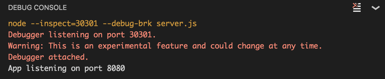 Notice that it was able to detect that the app's startup script is server.js, and once again, we don't need to change anything in order to make debugging just work.