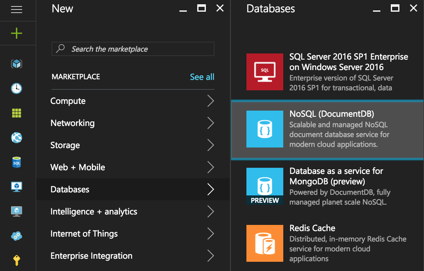 Nkey to create a new Azure resource, and selectDatabasesthenNoSQL (DocumentDB)