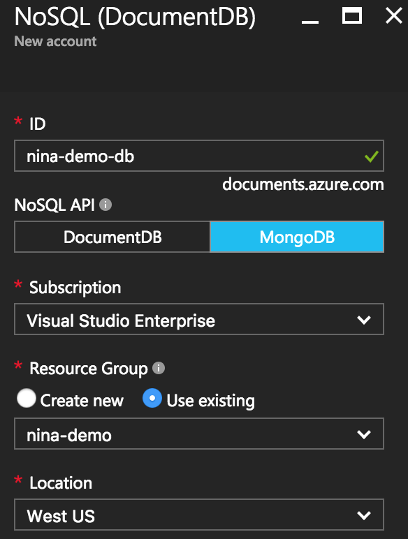 NoSQL APIto useMongoDBand itsResource GrouptoUse Existingand select the same resource group that you created for the App Service instance.