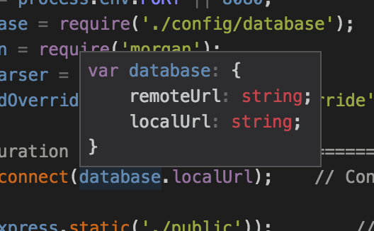 Auto-completion can provide huge productivity enhancements when writing/exploring code, since it prevents you from needing to keep referencing documentation or worrying about API typos. For example, let's augment the hardcoded MongoDB connection string with an environment variable by changing line 12 from this: